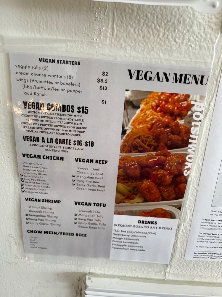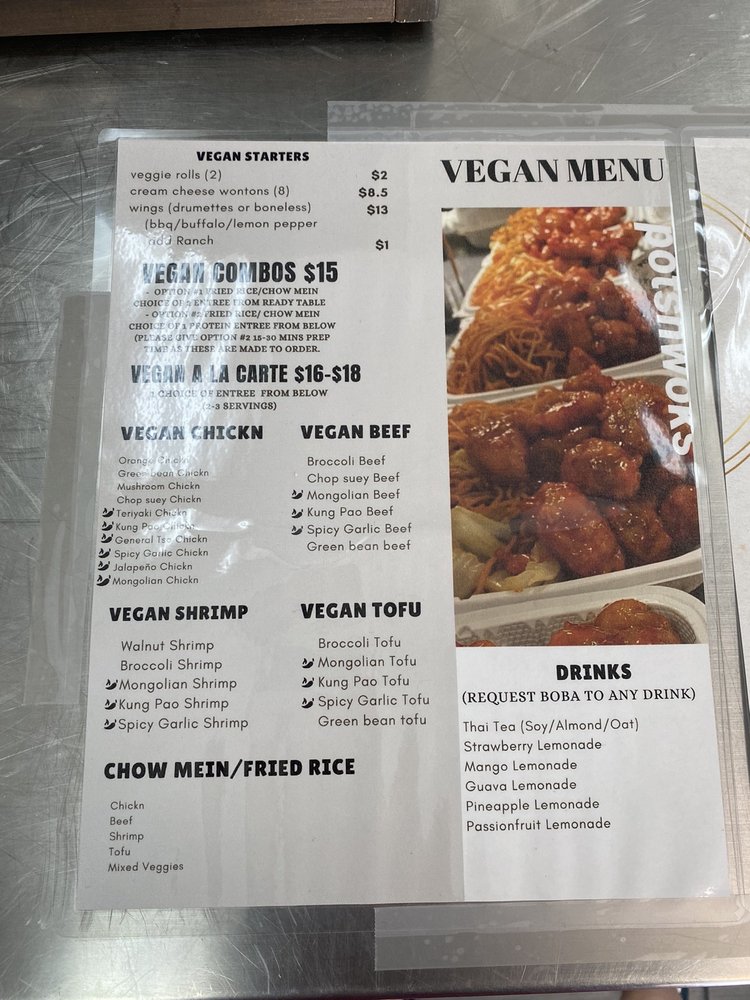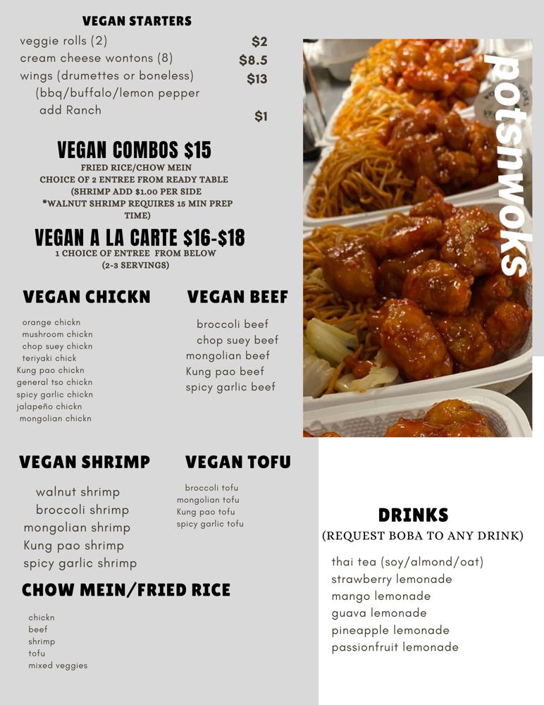 Introducing the menu at Pots n’ Woks, a vegan Chinese restaurant in Whittier, CA, offers a variety of delicious dishes with a focus on fresh ingredients and vegan options. Customers rave about the consistency and quality of the food, such as the orange chickn, mushroom chickn, Mongolian tofu, beef broccoli, and Mongolian beef. The ube milk tea is a must-try beverage that perfectly complements the flavorful dishes. With a range of amenities including takeout, reservations, delivery, and outdoor seating, Pots n’ Woks provides a classy yet casual dining experience suitable for groups and families. The walnut shrimp and Thai boba are highly recommended by patrons, while the generous portions and friendly service make this hidden gem a top choice for Chinese comfort food.